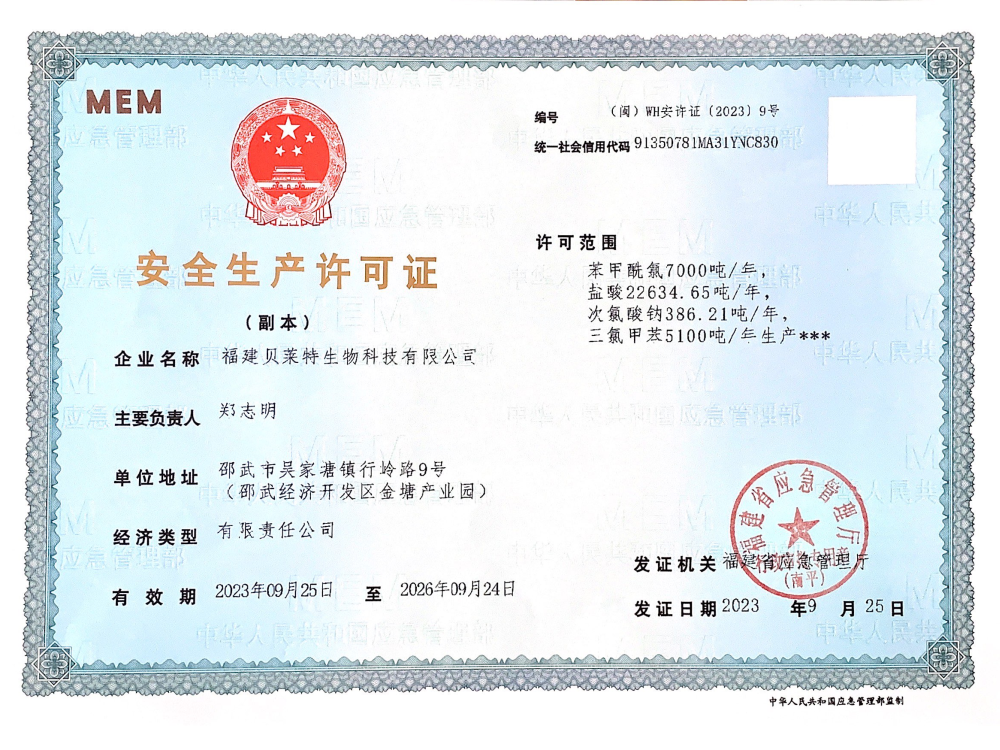 福建贝莱特生物科技有限公司已通过安全验收并于2取得安全生产许可证